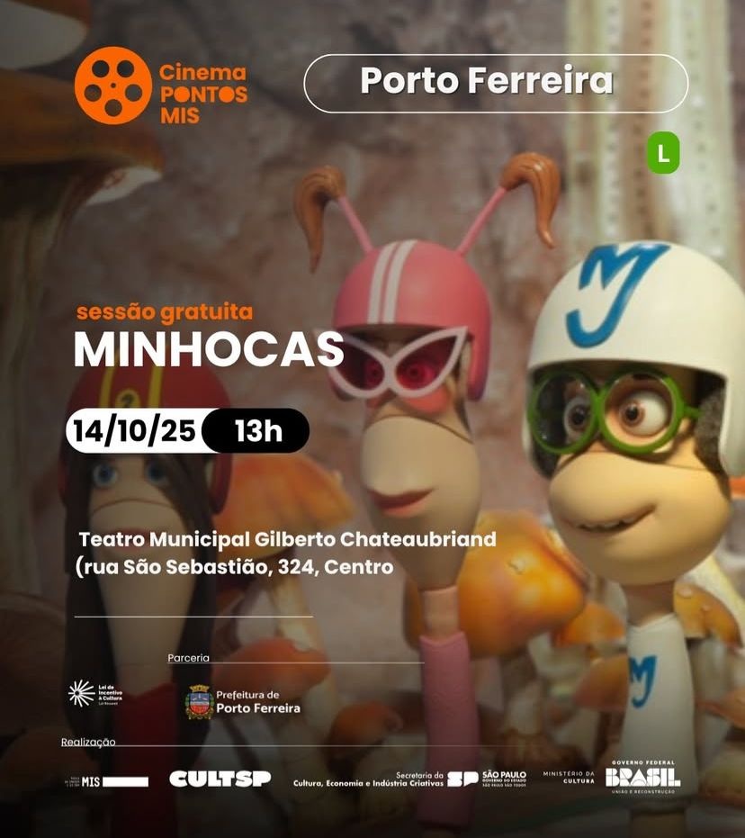 A Secretaria de Cultura e Economia Criativa de Porto Ferreira convida a população para mais uma edição do projeto Pontos MIS, que promove sessões de cinema gratuitas em parceria com o Museu da Imagem e do Som (MIS) de São Paulo. Desta vez, o filme escolhido é a animação “Minhocas”, que será exibido na próxima terça-feira, 14 de outubro, às 13h.
