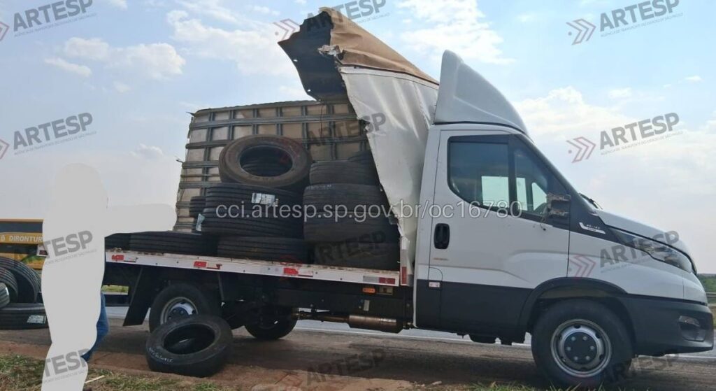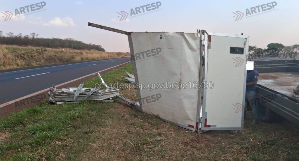 Parte do baú de um utilitário Iveco Daily se desprendeu enquanto o veículo seguia no sentido Norte da Rodovia Anhanguera (SP-330), em Orlândia