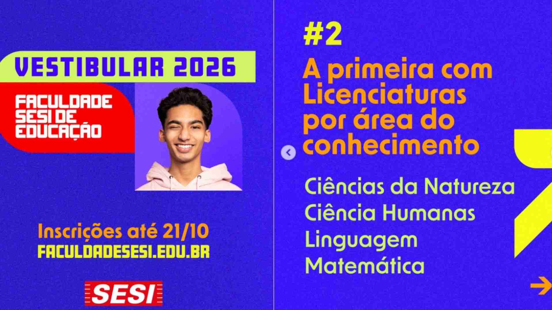 Termina nesta terça-feira, 21 de outubro de 2025 as inscrições para o vestibular da Faculdade Sesi-SP de Educação. Para se inscrever, o candidato deve acessar o site da faculdade. O processo seletivo será realizado em duas etapas.