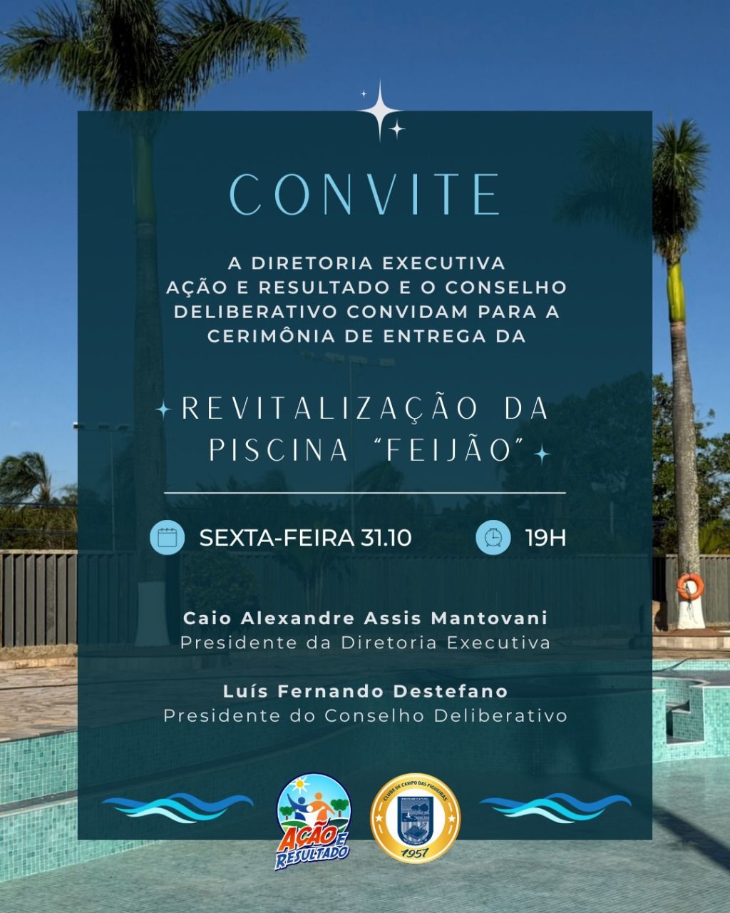 O Clube de Campo das Figueiras convida seus associados para a cerimônia de entrega da piscina “Feijão”, totalmente renovada para oferecer mais conforto, lazer e bem-estar.