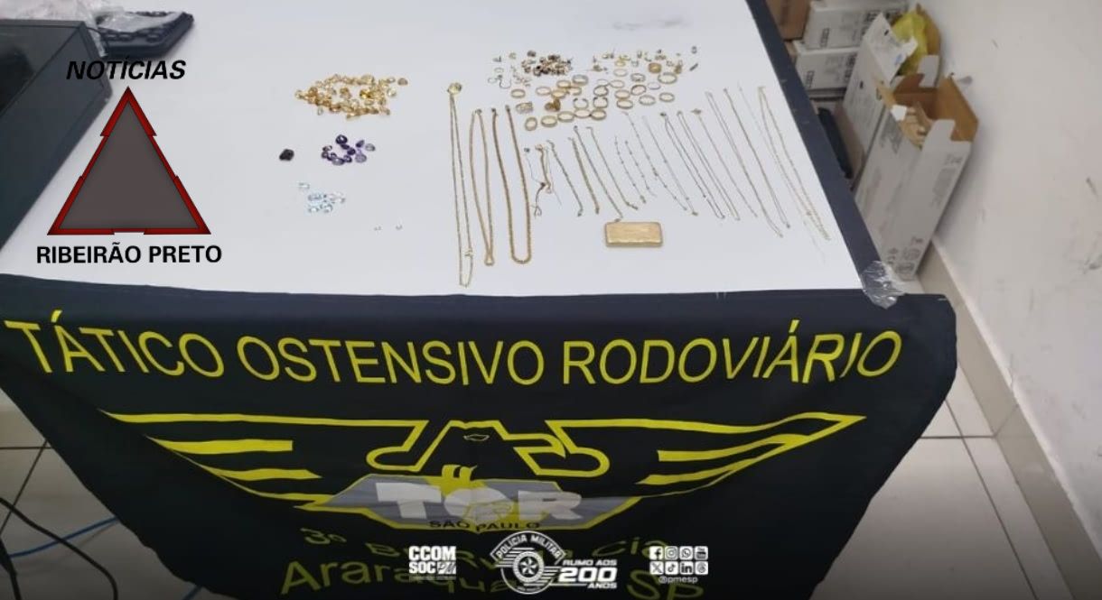Durante uma ação de patrulhamento na Rodovia Comandante João Ribeiro de Barros (SP-255), em Araraquara, equipes do Tático Ostensivo Rodoviário (TOR) apreenderam uma barra de ouro, diversas joias e pedras preciosas na última quarta-feira (29).