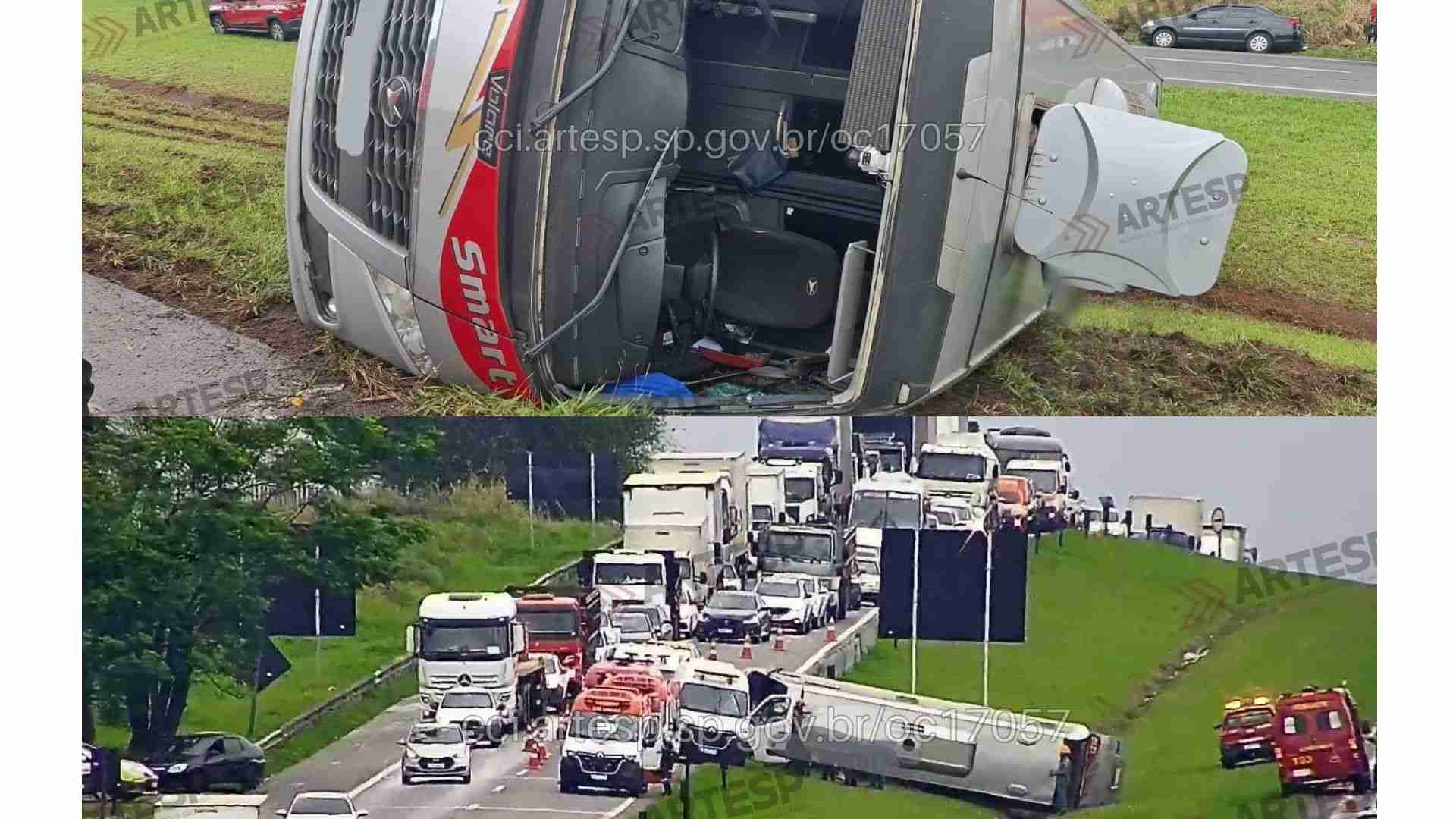 Acidente com 16 pessoas a bordo mobilizou múltiplas equipes de resgate e causou congestionamento na rodovia; veículo foi removido cerca de uma hora e meia após o tombado.