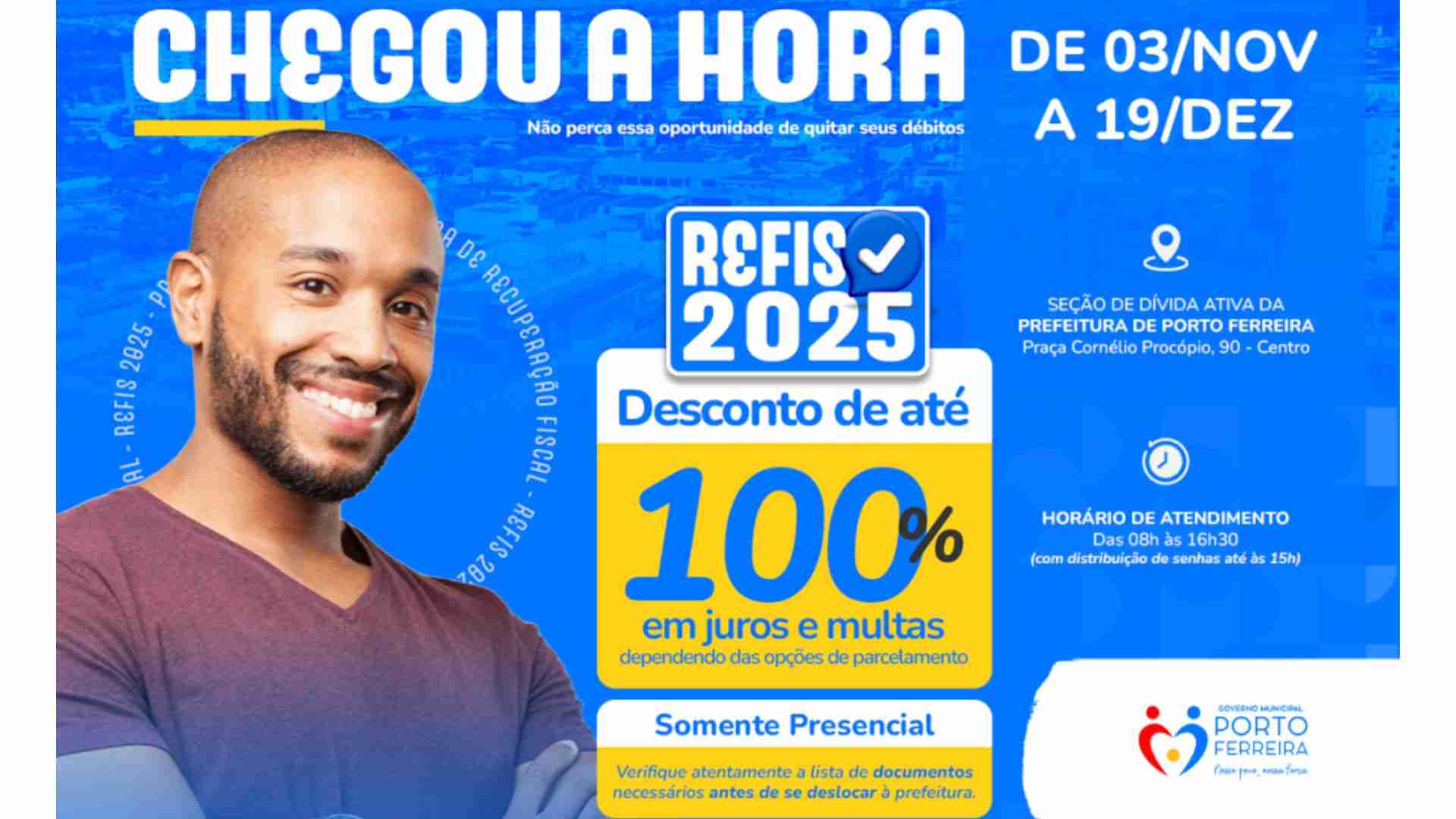 A Prefeitura de Porto Ferreira inicia na segunda-feira (03/11) o Programa de Recuperação Fiscal – Refis 2025. Essa é uma ótima chance de regularizar débitos fiscais e não tributários com a Fazenda Pública do Município, com condições especiais para pagamento.