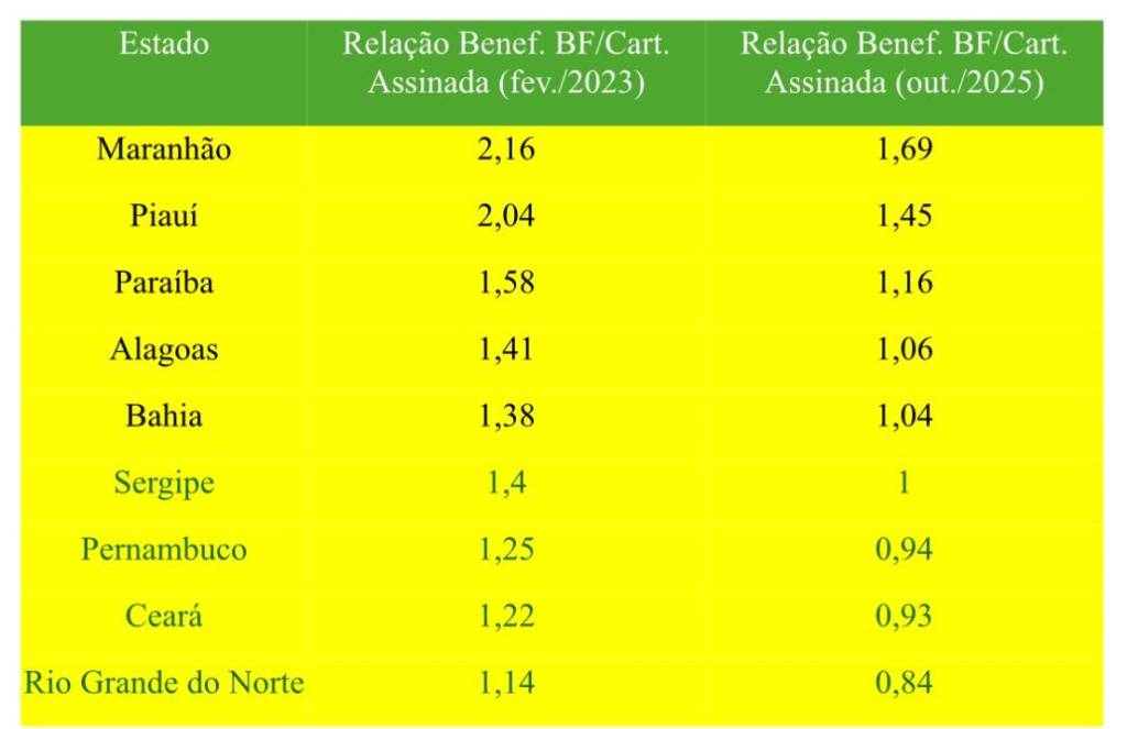 O avanço na geração de empregos também começa a se refletir em outras partes da região. Alagoas e Bahia apresentam desempenho positivo e devem, em breve, inverter a relação entre trabalhadores formais e beneficiários. Já Maranhão e Piauí, que ainda mantêm os piores índices, mostram melhora consistente: no Maranhão, a proporção entre famílias beneficiadas e empregados formais caiu de 2,16 para 1,69 desde o início do governo Lula, enquanto no Piauí o índice passou de 2,04 para 1,45.