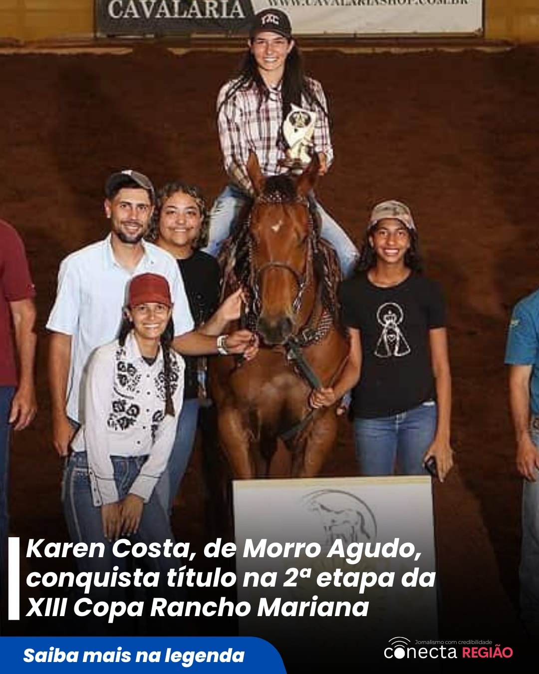 A morroagudense Karen Fernanda Costa, de 20 anos, conquistou o título da 2ª etapa da XIII Copa Rancho Mariana, realizada no último fim de semana em Altinópolis (SP). A competição é uma das mais tradicionais do interior paulista e reuniu atletas de várias regiões nas disputas de Três Tambores, modalidade que exige velocidade, precisão e total sintonia entre cavalo e cavaleiro.