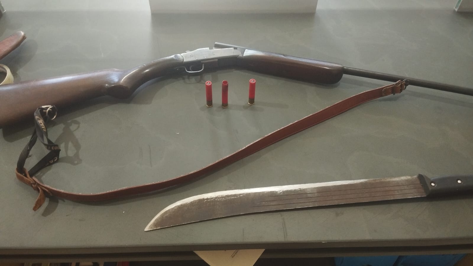Durante a abordagem, o suspeito foi encontrado deitado na cama, próximo a uma espingarda calibre .36 e um facão. Os policiais apreenderam a arma de fogo, dois cartuchos intactos e um deflagrado.