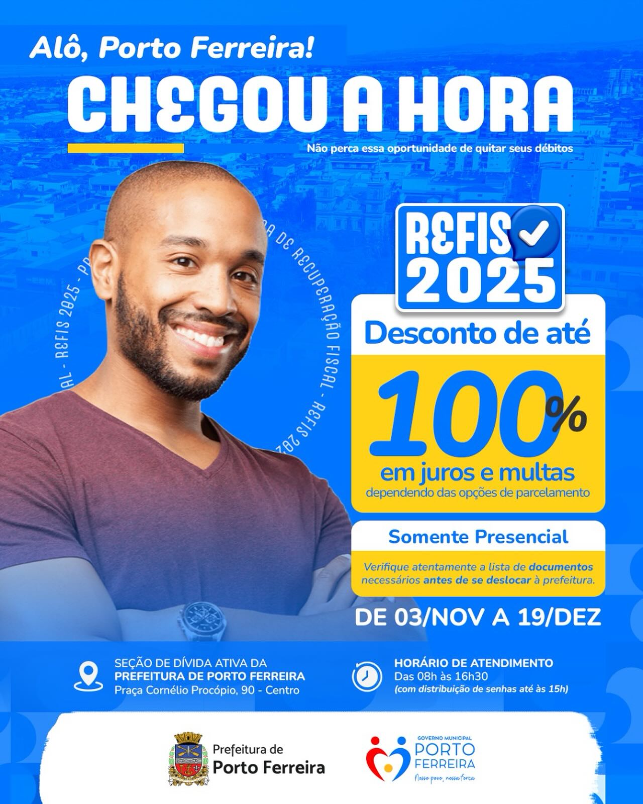 A Prefeitura de Porto Ferreira iniciou na segunda-feira, 3 de novembro, o Programa de Recuperação Fiscal (Refis 2025). A iniciativa permite que moradores quitem ou parcelem débitos fiscais e não fiscais com condições diferenciadas de pagamento, beneficiando tanto os contribuintes quanto a arrecadação municipal.