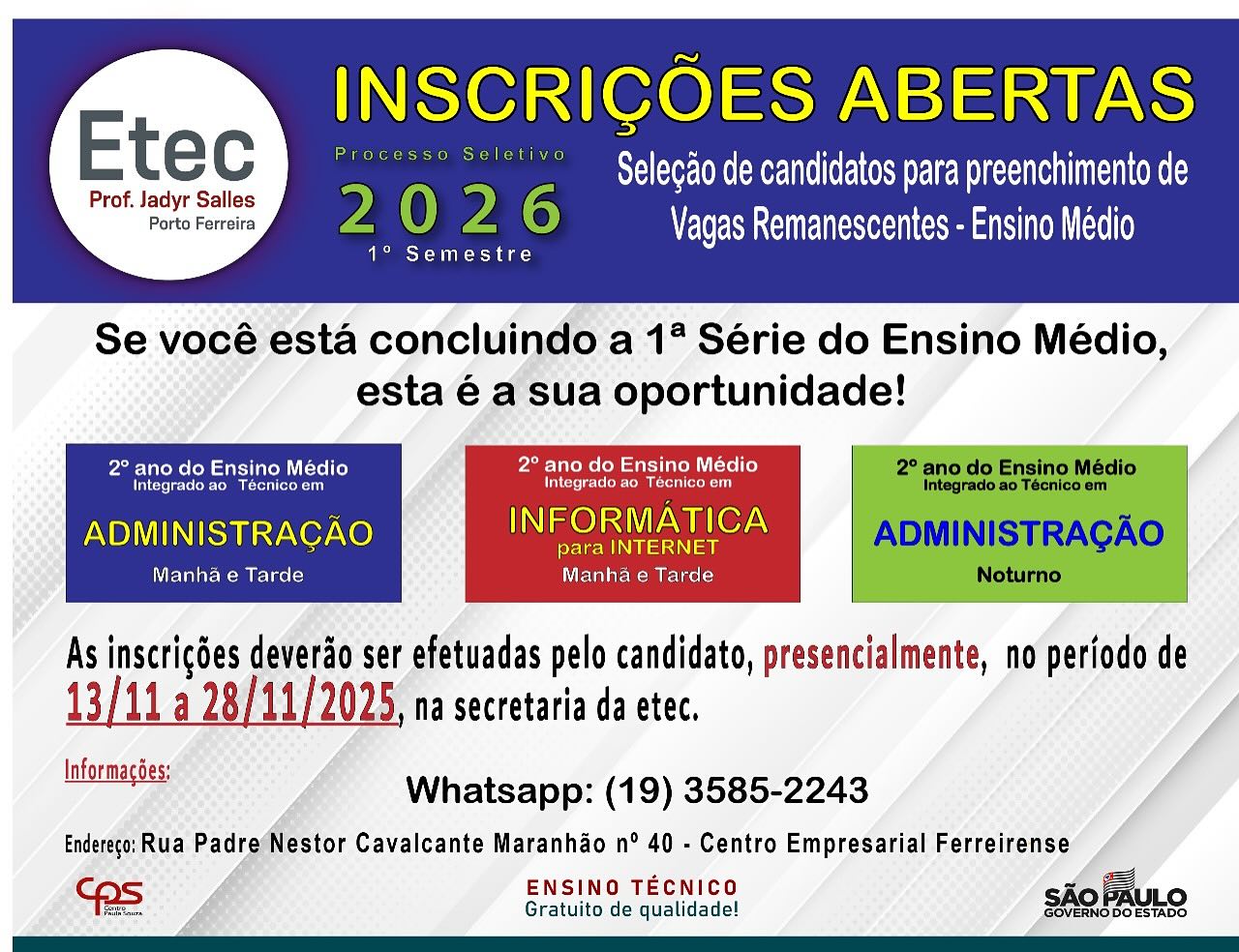 Atenção! Estão abertas as inscrições para vagas remanescentes do 2º ano do Ensino Médio em técnico em administração e informática em Porto Ferreira