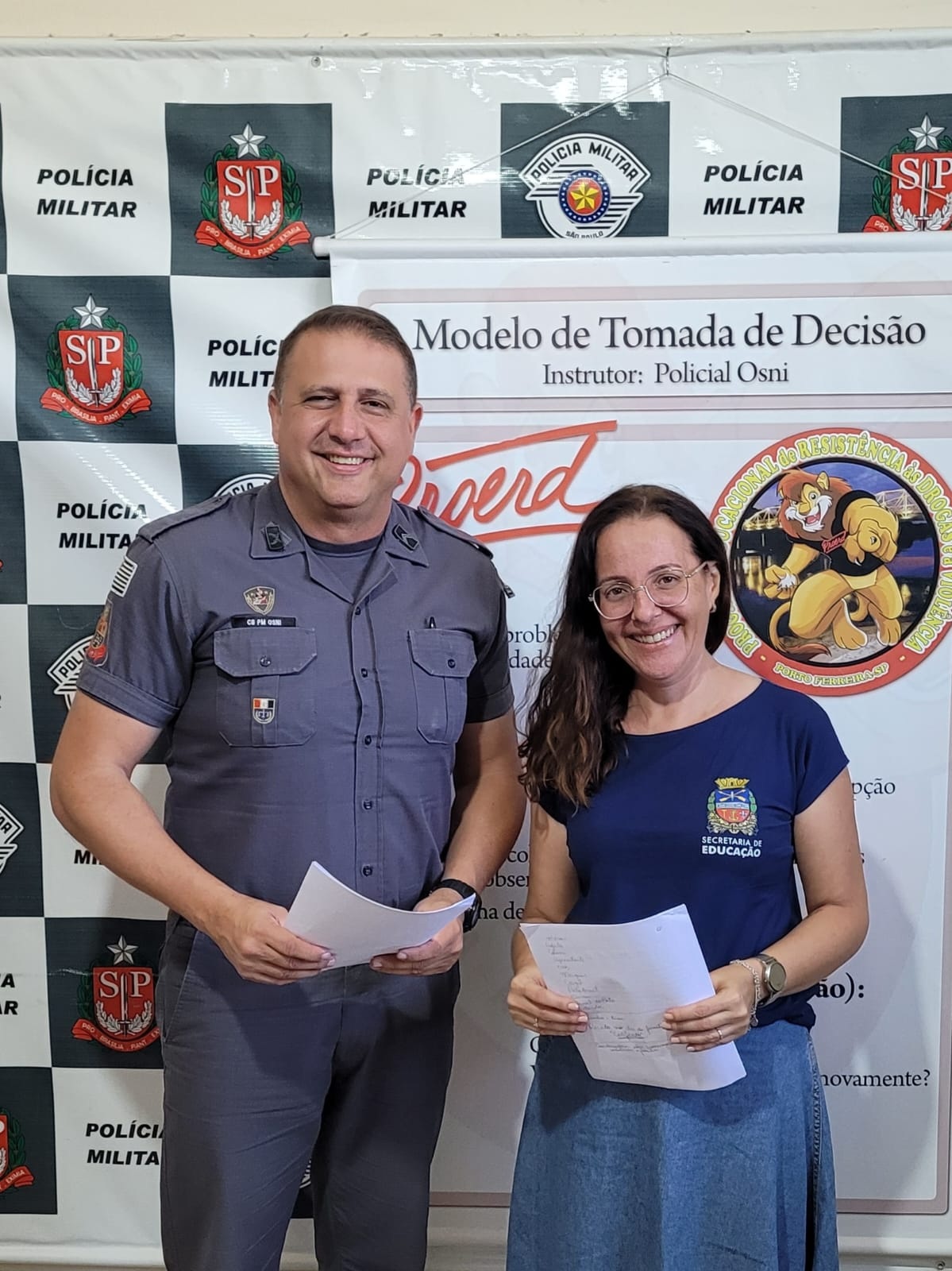 Participaram da reunião o instrutor do PROERD em Porto Ferreira, cabo PM Osni Luciano Martins, e a professora Juliana Turquetti, representante da Secretaria Municipal de Educação (SEDUC).