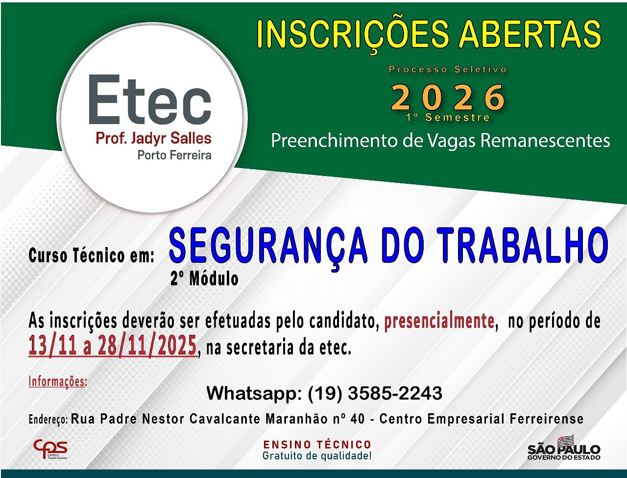 A Escola Técnica Estadual (Etec) está oferecendo uma nova oportunidade para quem deseja ingressar no segundo módulo da Habilitação Profissional Técnica em Segurança do Trabalho. São vagas remanescentes que permitem aos interessados garantir uma formação de qualidade e se preparar para as demandas do mercado de trabalho.