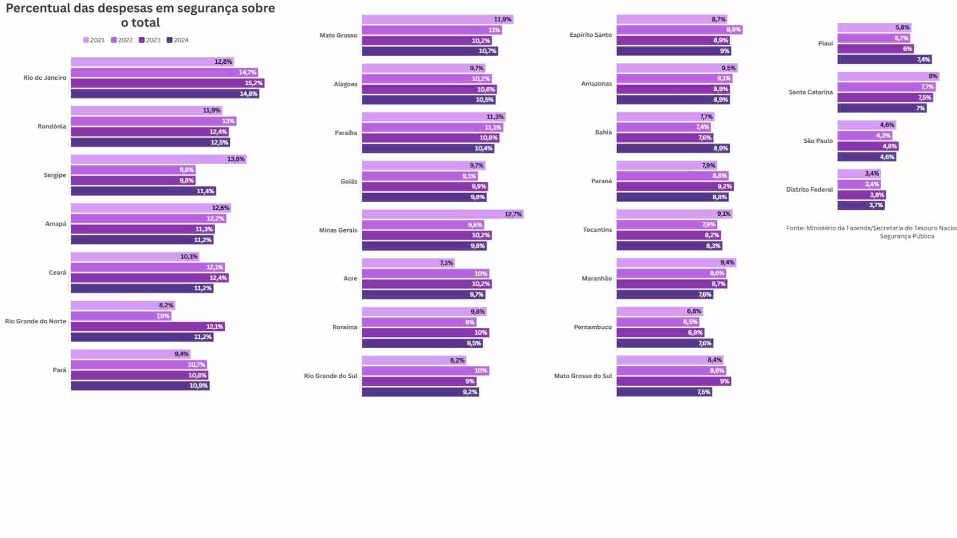 A situação é ainda mais desfavorável quando se analisa a participação do investimento em segurança no orçamento total do governo estadual. São Paulo registrou o último lugar no ranking, dedicando apenas 4,6% do seu orçamento total à segurança pública.