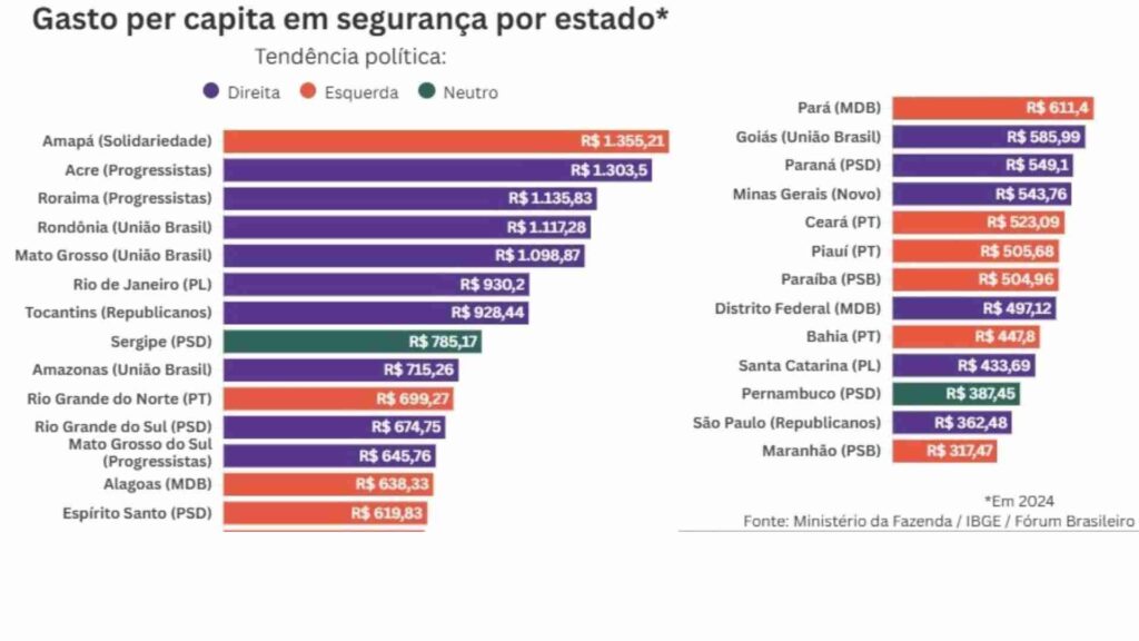 No quesito investimento per capita na segurança, São Paulo, com mais de 40 milhões de habitantes, ocupou a penúltima posição no ano passado (2023), com um aporte de R$ 362,48 por habitante. Este valor é superior apenas ao do Maranhão, um dos estados mais pobres da federação, que investiu R$ 317,47 por habitante.