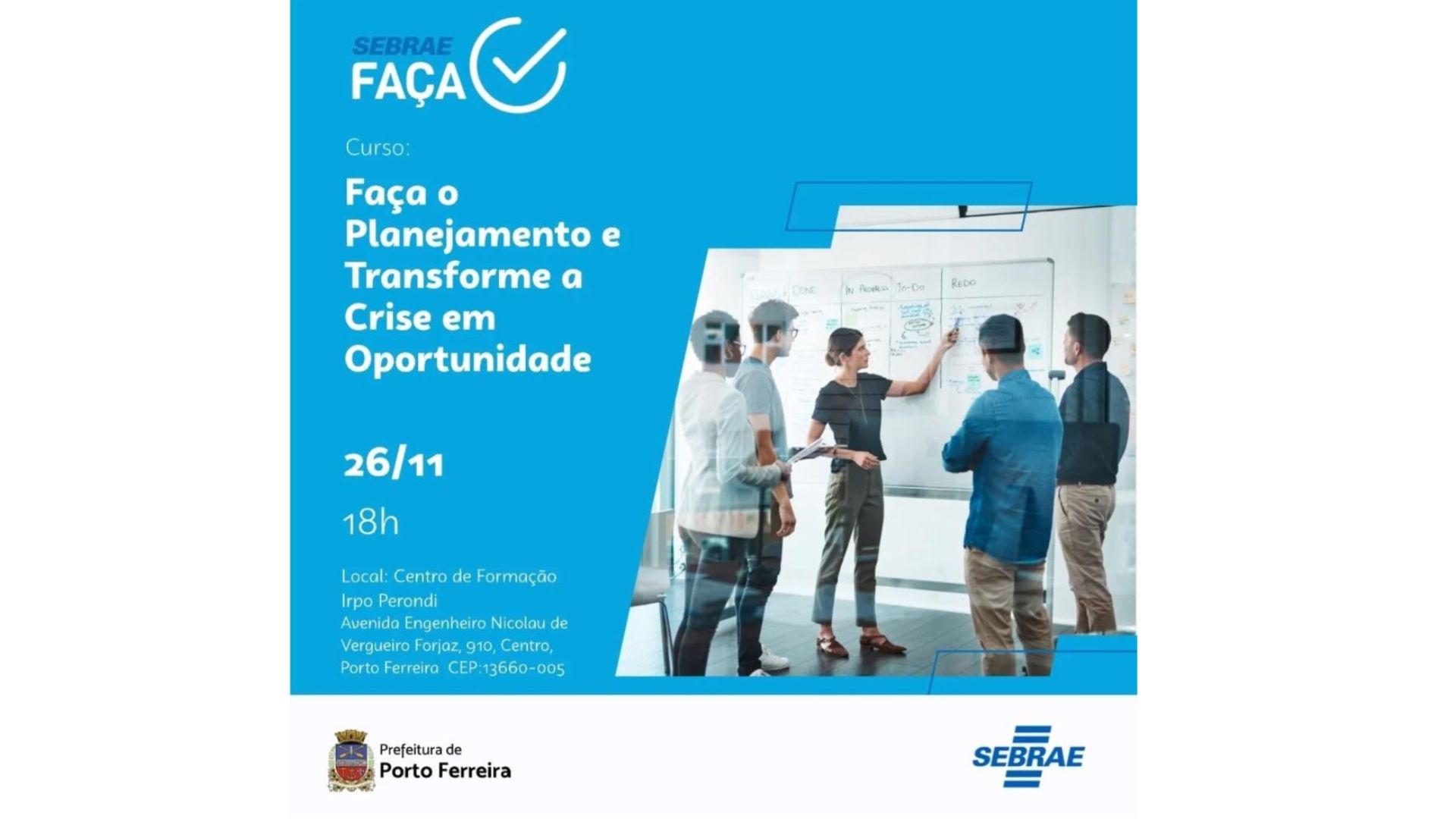 A Prefeitura de Porto Ferreira, por meio da Secretaria de Desenvolvimento Econômico e Turismo, em parceria com o Sebrae, traz mais uma oportunidade para quem deseja fortalecer sua caminhada empreendedora.