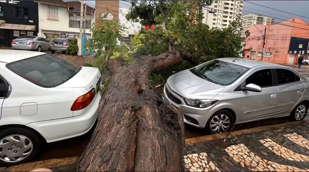 Um temporal intenso que atingiu Ribeirão Preto (SP) no início da tarde desta segunda-feira (24) causou a queda de uma árvore de grande porte na movimentada Avenida Nove de Julho. O incidente, no entanto, gerou uma cena surpreendente: a árvore desabou precisamente no pequeno espaço entre dois carros estacionados, sem atingir nenhum dos veículos. Ninguém ficou ferido no ocorrido.