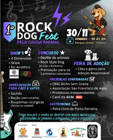 O Conselho Municipal de Proteção e Defesa Animal de Porto Ferreira, em parceria com a Prefeitura e diversas entidades ligadas à causa animal, organiza neste domingo (30) o 1º Rock Dog Fest. A proposta é unir música, conscientização e solidariedade em um encontro voltado ao bem-estar dos animais do município.