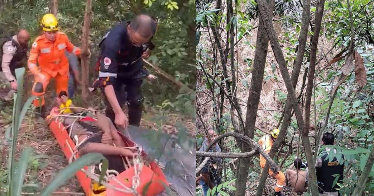 Vítima foi resgatada consciente, com ferimentos nos pés, corte no joelho e múltiplas escoriações