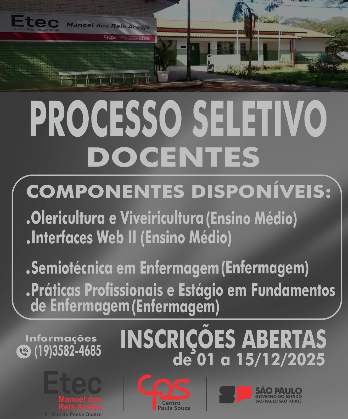 A Etec Manoel dos Reis Araújo, em Santa Rita do Passa Quatro, iniciou o período de inscrições para o Processo Seletivo Simplificado destinado à contratação de docentes. A seleção contempla componentes curriculares das áreas de enfermagem e ensino médio, distribuídos em quatro editais.