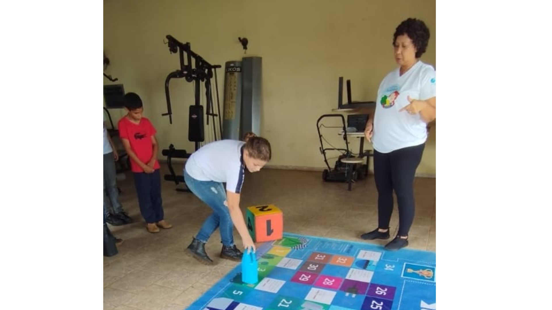 A atividade consiste em um tapete educativo no qual as crianças jogam o dado e avançam casas, sendo incentivadas a refletir sobre hábitos positivos e negativos no cuidado com o planeta. Quando caem em casas que representam atitudes prejudiciais, como “jogou lixo no chão”, precisam retornar algumas posições. Já nas casas com boas práticas, como “plantar uma árvore melhora a umidade do ar”, avançam no percurso, reforçando o impacto das escolhas conscientes.