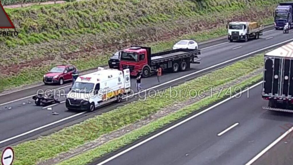 Colisão entre moto e caminhão no km 384 da Rodovia Armando Sales de Oliveira, em Bebedouro (SP), mobiliza equipes de resgate; pista leste segue bloqueada.