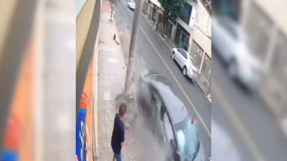 Nas imagens, é possível ver a motorista em alta velocidade colidindo com um poste e quase atingindo o homem que caminhava na calçada. O pedestre se afasta rapidamente, visivelmente assustado, e segue seu caminho.