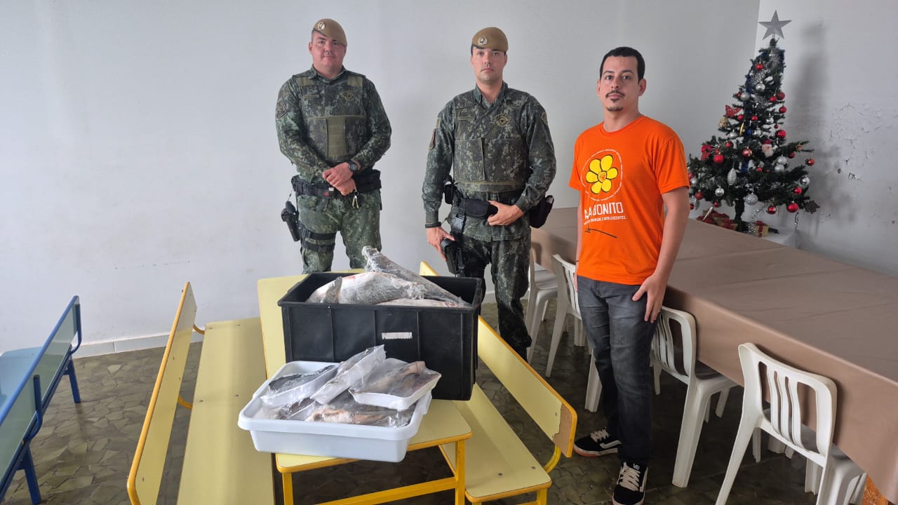 Após avaliação nutricional que constatou condições higiênico-sanitárias adequadas, os pescados foram destinados ao Lar André Luiz. Um auto de infração ambiental foi lavrado com multa de R$ 1.815,08, conforme a resolução SIMA 005/21.
