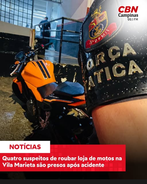 Uma loja de motocicletas foi alvo de um roubo na tarde desta terça-feira na Avenida Francisco de Angelis, no bairro Vila Marieta, em Campinas. Segundo a Polícia Militar, oito homens armados invadiram o estabelecimento e fugiram levando pelo menos cinco motos.
