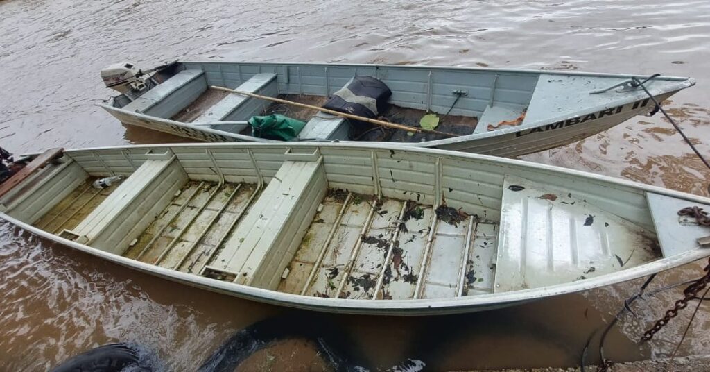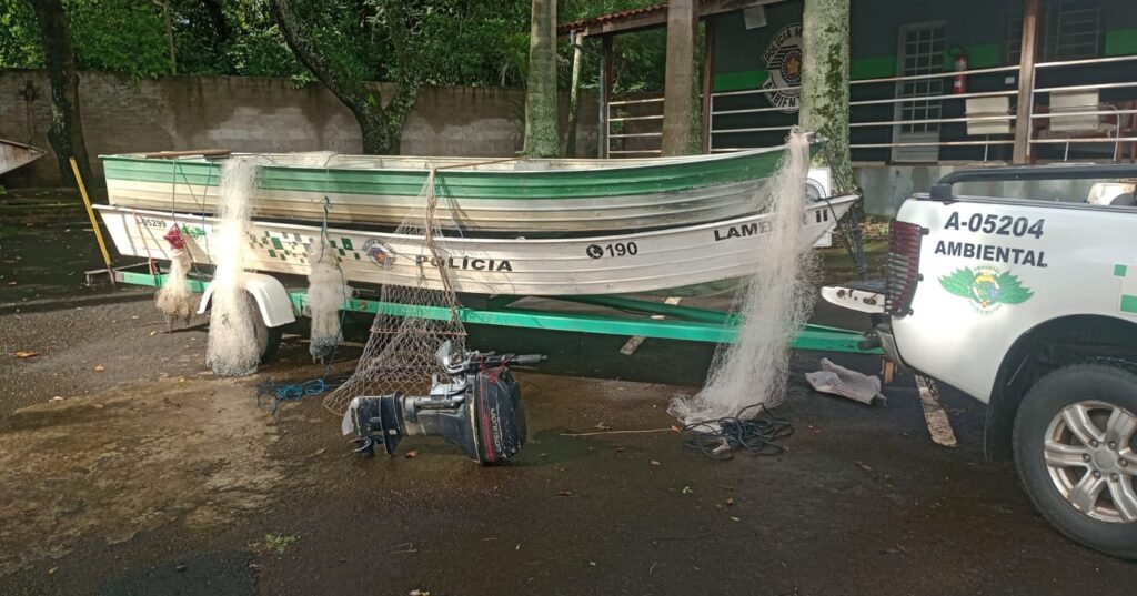 No local, os policiais encontraram uma embarcação de alumínio com sinais de uso recente. Em diligência próxima, em um rancho da região, foram apreendidos equipamentos utilizados na pesca ilegal, além de peixes das espécies pintado e cascudo, totalizando cerca de 58 quilos.