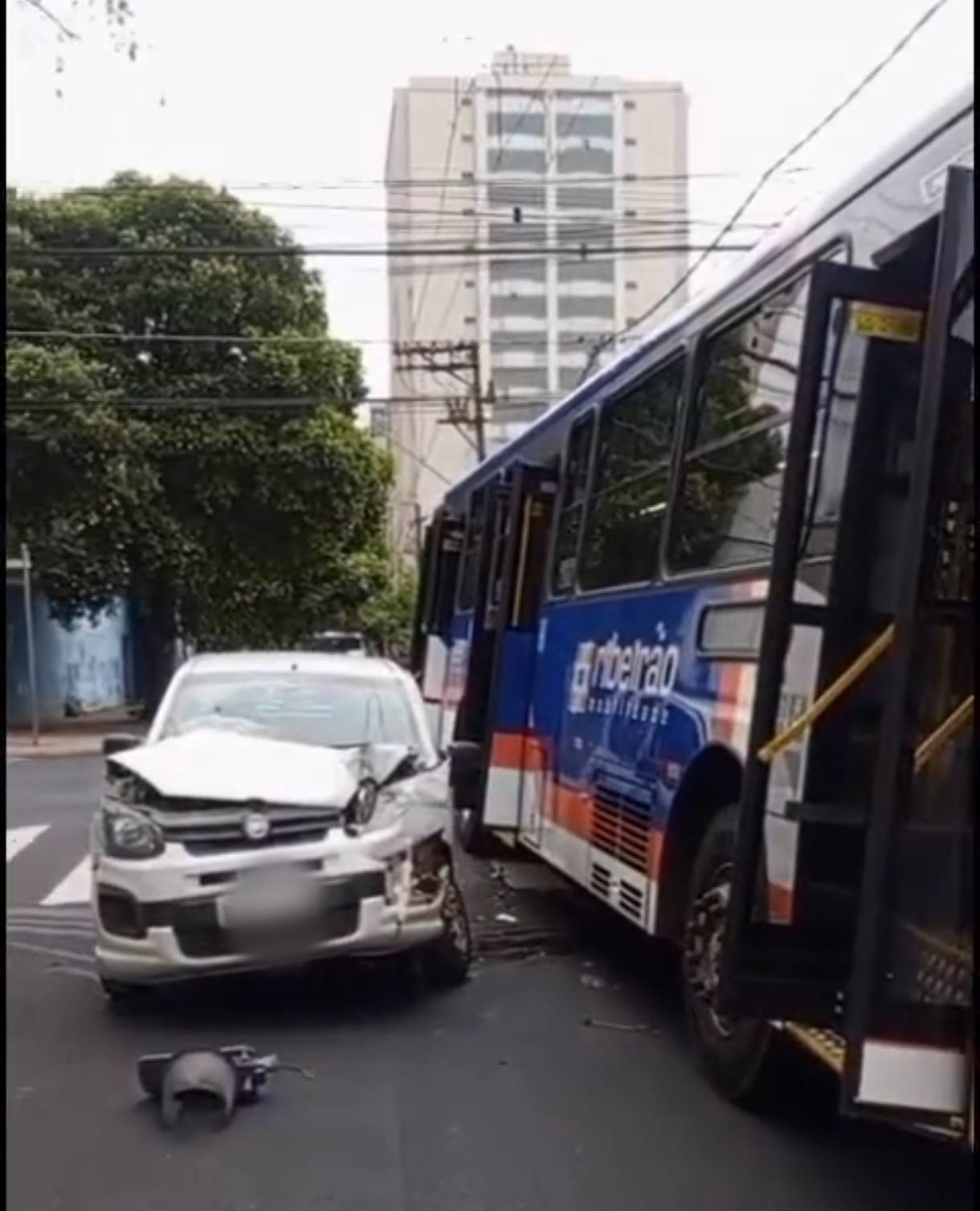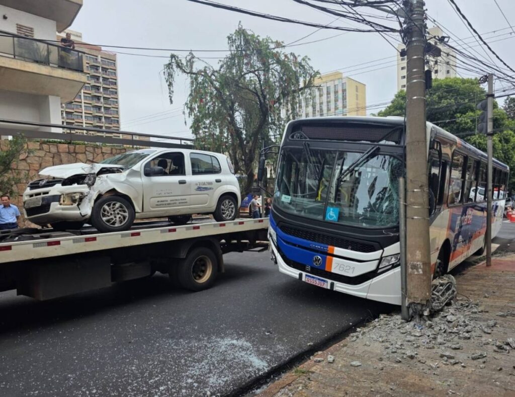 Após a batida com um Fiat Uno Vivace, o motorista do ônibus perdeu o controle e atingiu um poste de iluminação, que ficou apoiado no coletivo. Apesar dos danos aos veículos e ao poste, não houve feridos.