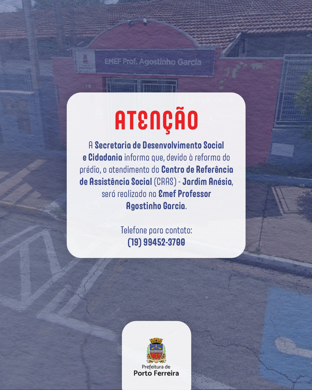 A Secretaria de Desenvolvimento Social e Cidadania informou que o atendimento do Centro de Referência de Assistência Social (CRAS) Jardim Anésia será realizado temporariamente em outro local em Porto Ferreira. A mudança ocorre em razão das obras de reforma no prédio onde o serviço funciona atualmente.