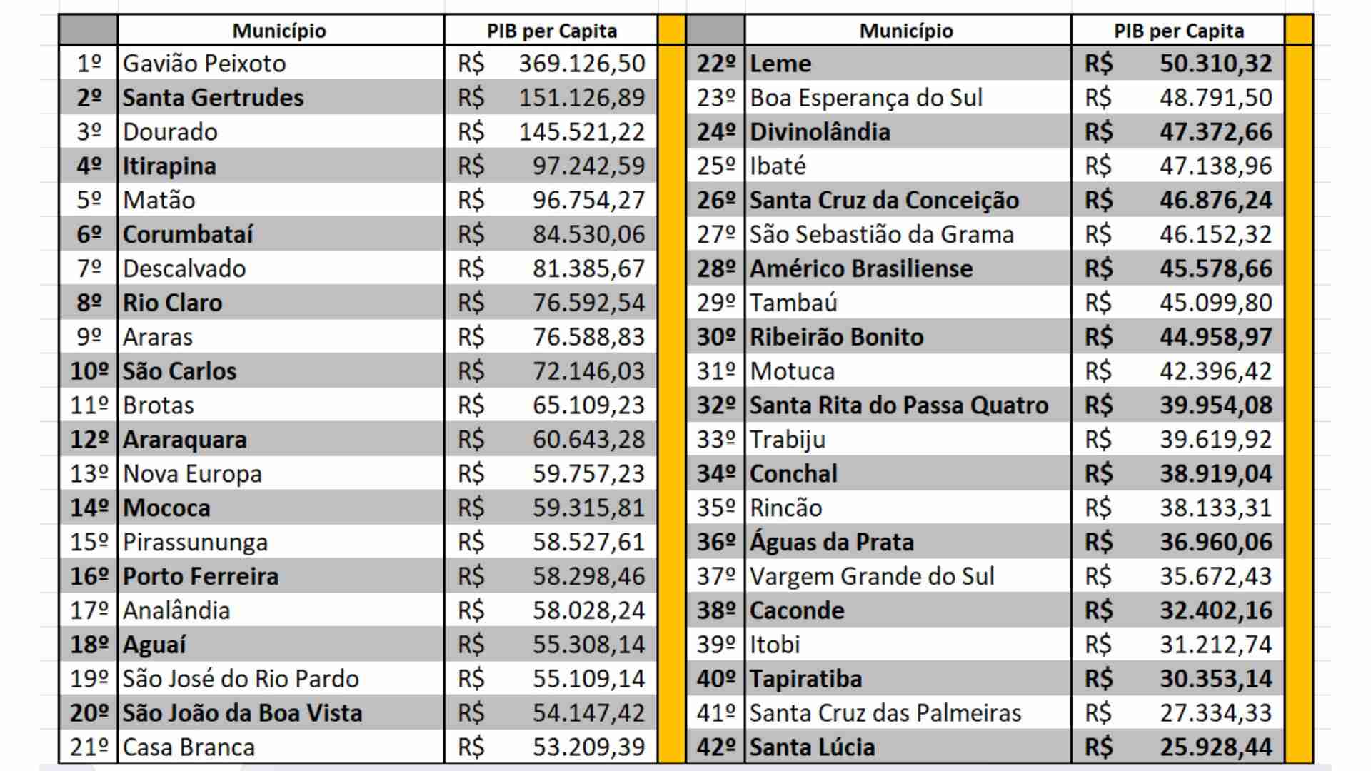 A análise dos dez municípios com maior PIB per capita na região Central revela um perfil econômico consistente: a predominância de municípios com forte presença industrial ou serviços, complementado pelo agronegócio. Além de Gavião Peixoto, destaque para Santa Gertrudes (R$ 151.126,89), Dourado (R$ 145.521,22), Itirapina (R$ 97.242,59) e Matão (R$ 96.754,27).