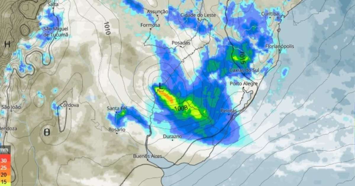 O primeiro ciclone extratropical de 2026 está em formação entre o Uruguai e o Rio Grande do Sul e deve atingir principalmente a região Sul do Brasil ao longo do fim de semana. O sistema se desenvolve com a chegada de uma frente fria e pode provocar pancadas de chuva, descargas elétricas, ventos intensos e eventual queda de granizo.
