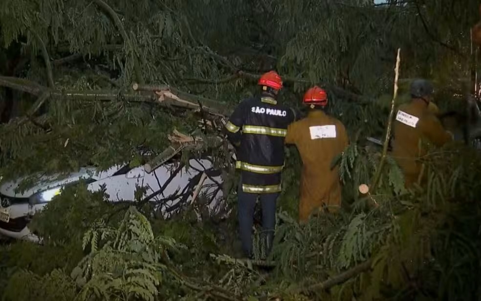 A sibipiruna atingiu três veículos e deixou duas pessoas feridas, que foram socorridas pelo Samu e encaminhadas a hospitais. Segundo dados oficiais, a chuva acumulou cerca de 45 milímetros em uma hora, com rajadas de vento superiores a 60 km/h.