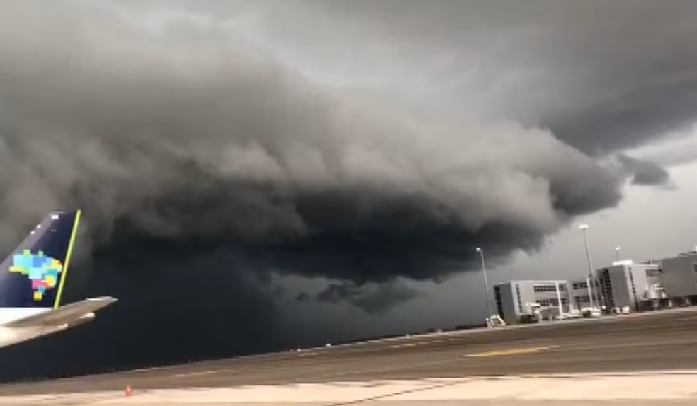 Uma “nuvem prateleira” chamou atenção sobre o Aeroporto Internacional de Viracopos, em Campinas (SP), no fim da tarde desta quinta-feira (15). A formação carregada, típica de temporais, encobriu o terminal e impressionou moradores e viajantes.