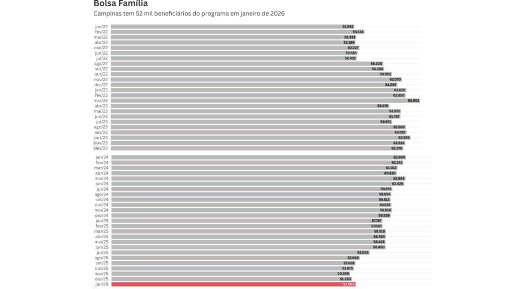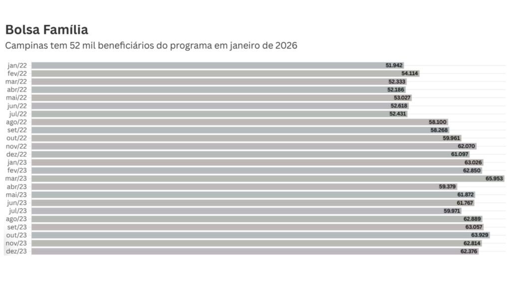 A cidade de Campinas registrou, em dezembro de 2025, o menor número de famílias beneficiárias do programa Bolsa Família para o mês desde 2022. Os dados mais recentes do Ministério do Desenvolvimento e Assistência Social, Família e Combate à Fome (MDS) apontam que 50.539 famílias receberam o auxílio, encerrando um ano de quedas consecutivas e marcando uma redução significativa em relação aos anos anteriores.