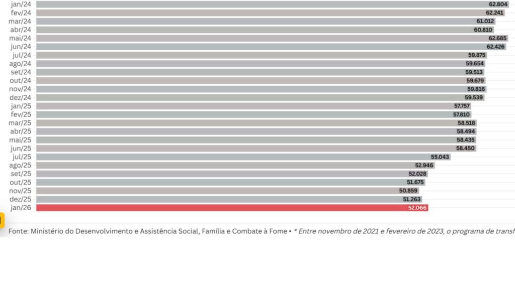 A partir de então, os números começaram a declinar. Em dezembro de 2022, eram 61.097 famílias; em dezembro de 2023, 62.376; e em dezembro de 2024, 59.539. A queda de cerca de 19% entre dezembro de 2024 e dezembro de 2025 (8.990 famílias a menos) é a mais acentuada da série histórica recente.