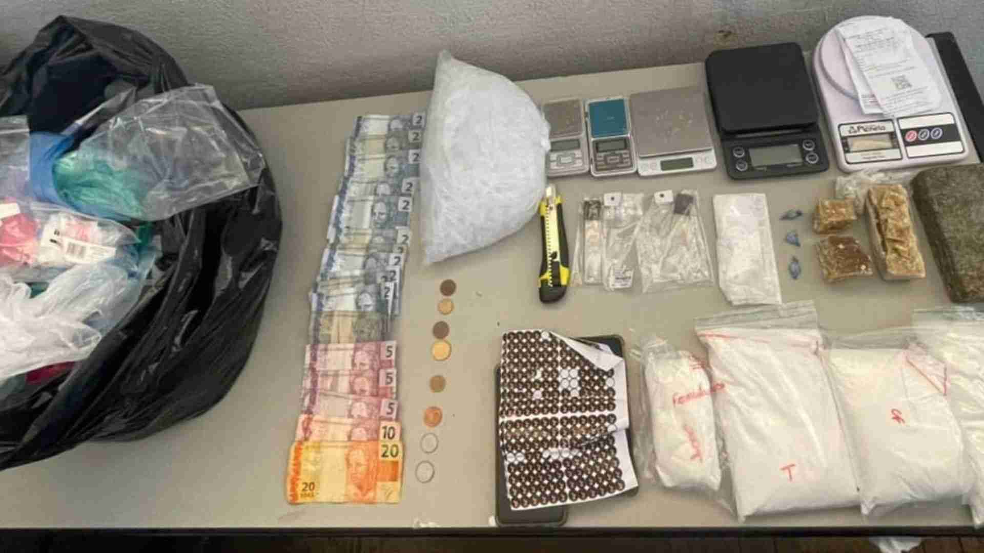 Na revista pessoal, nada de ilícito foi encontrado com os suspeitos. No entanto, em vistoria realizada no interior da mochila, foram localizados diversos entorpecentes e materiais utilizados para o tráfico, sendo apreendidos aproximadamente 1,2 kg de substância análoga à cocaína, 317 gramas de crack e 440 gramas de maconha, além de cinco balanças de precisão, um estilete, lâminas de reposição e dois aparelhos celulares.