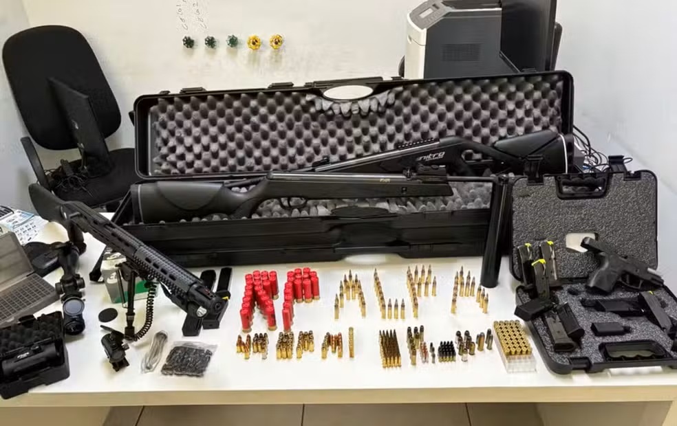 Ainda segundo a polícia, a mulher informou que havia outras armas e munições guardadas no imóvel e indicou o local. Em um armário trancado no quarto, os policiais encontraram 31 itens, entre munições, cartuchos, carregadores, chumbo, uma pistola e duas carabinas. Todo o material era mantido de forma irregular.