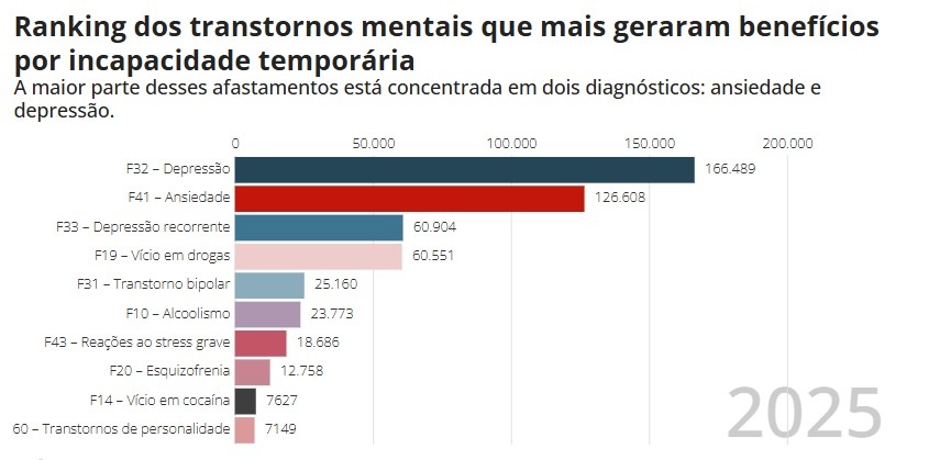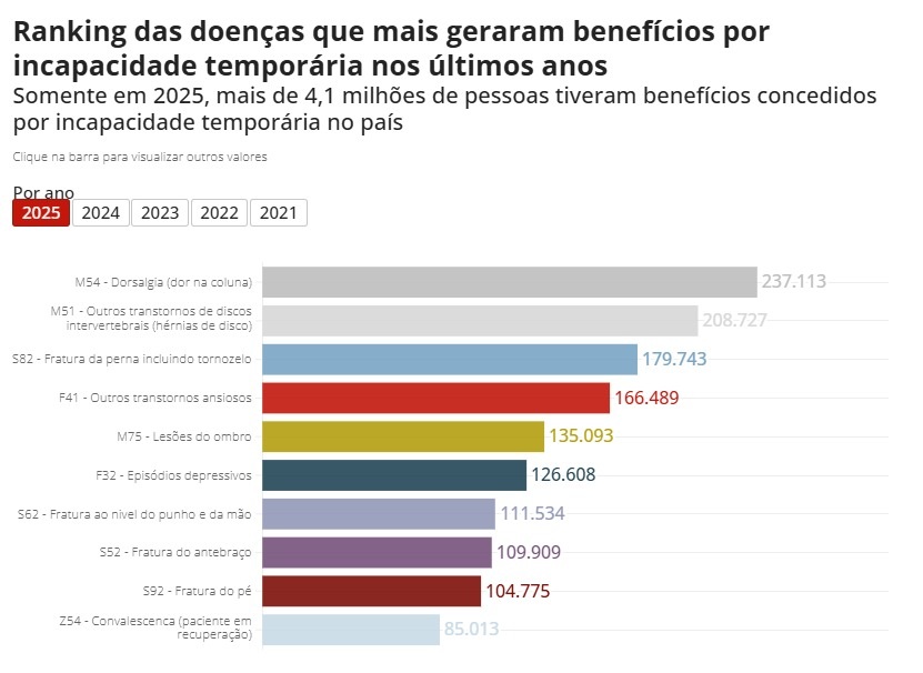As dores na coluna seguem como principal motivo: a dorsalgia liderou os casos com 237 mil afastamentos, seguida por hérnia de disco, com 208 mil. Os transtornos mentais, como ansiedade e depressão, já respondem por mais de 546 mil afastamentos, recorde pelo segundo ano em uma década.