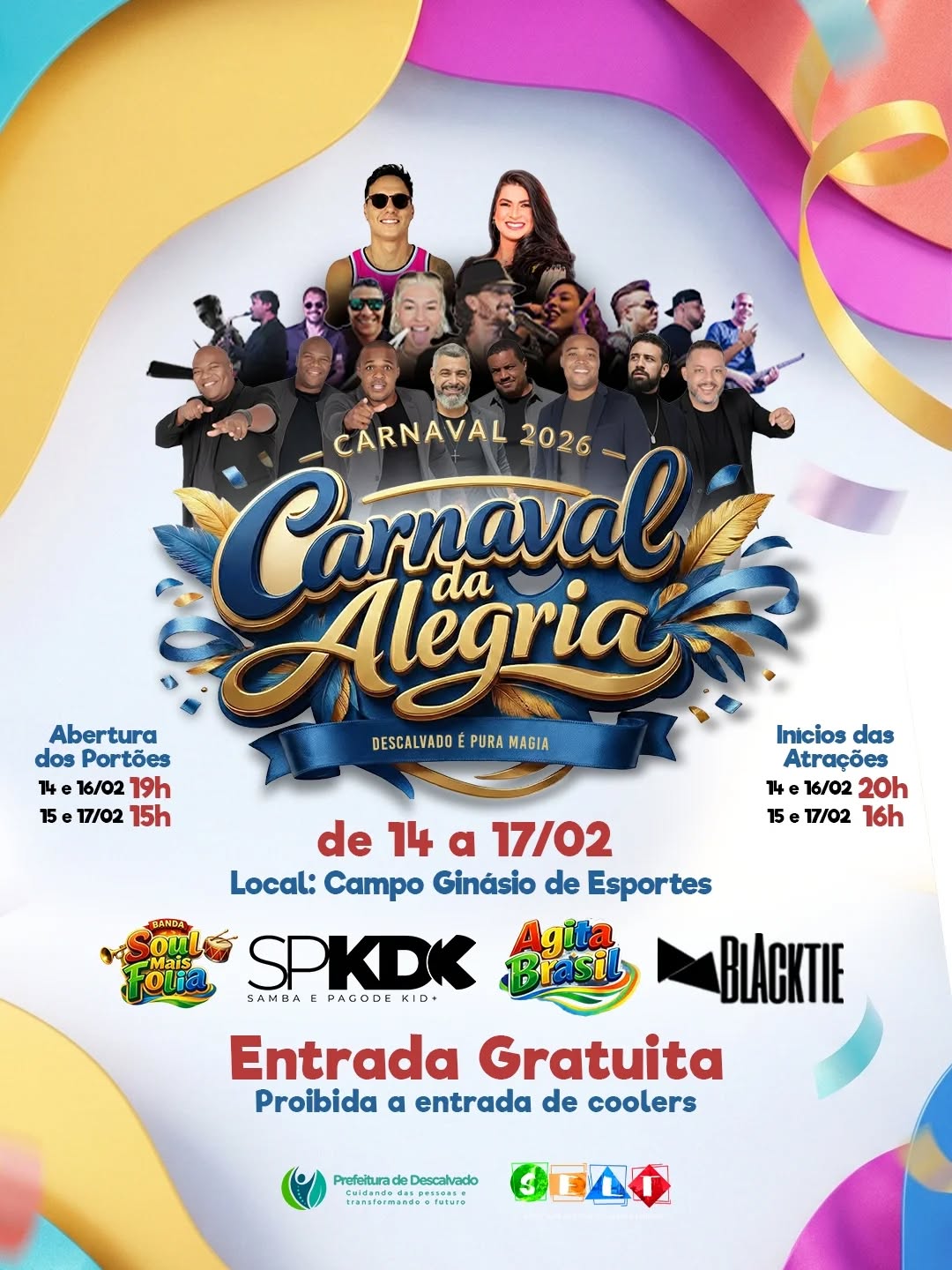 Promovido com apoio da Prefeitura de Descalvado, o Carnaval da Alegria 2026 aposta em uma estrutura voltada para toda a família e reforça a tradição carnavalesca do município. A programação completa com horários e atrações deve ser divulgada em breve nas redes sociais oficiais do evento.
