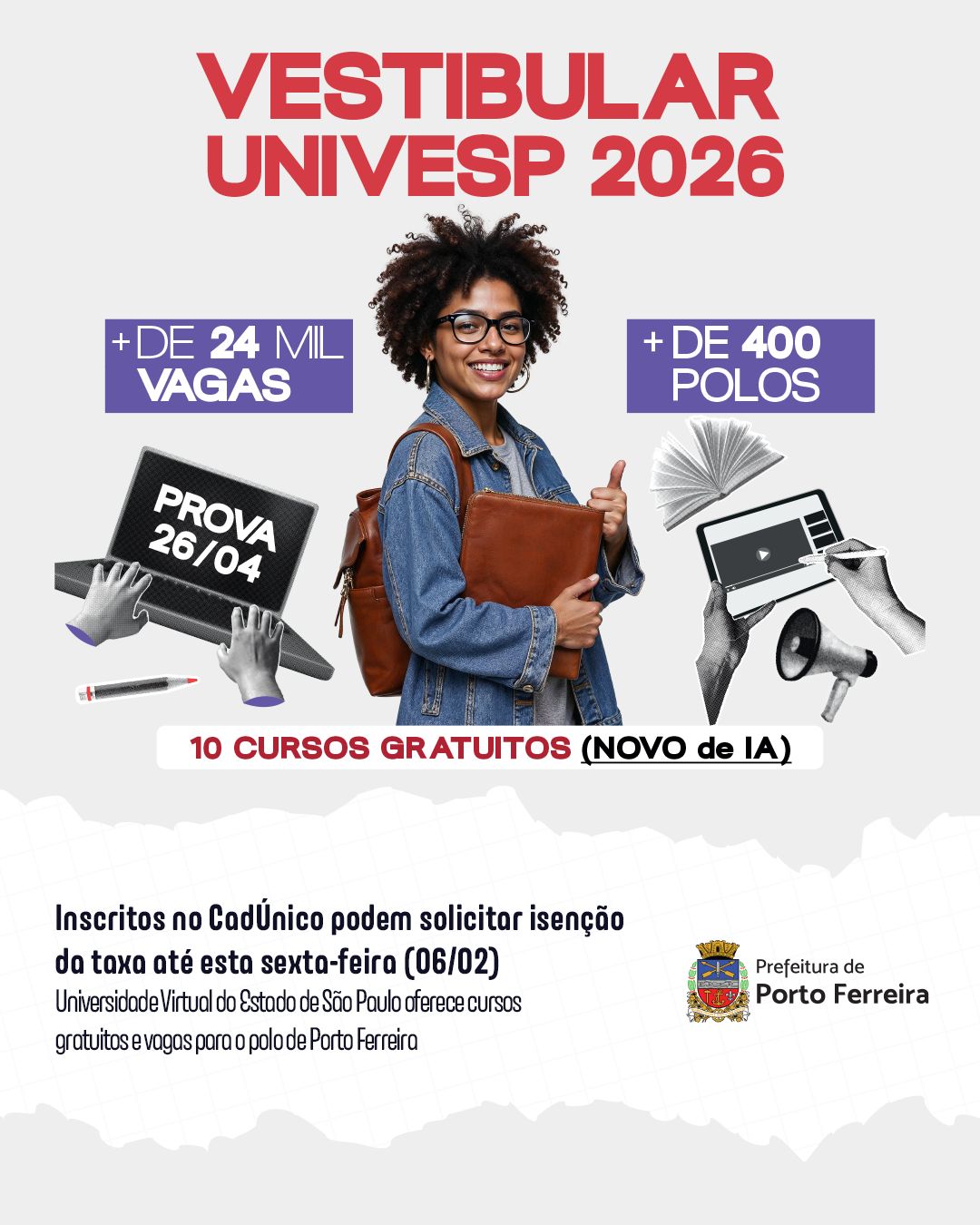 A Universidade Virtual do Estado de São Paulo, Univesp, abriu as inscrições para o Vestibular 2026, oferecendo cursos 100% gratuitos e com vagas disponíveis para o polo de Porto Ferreira. Os interessados podem se inscrever até o dia 11 de março, às 23h59, exclusivamente pelo site vestibular.univesp.br. A taxa de inscrição é de R$ 47,50.