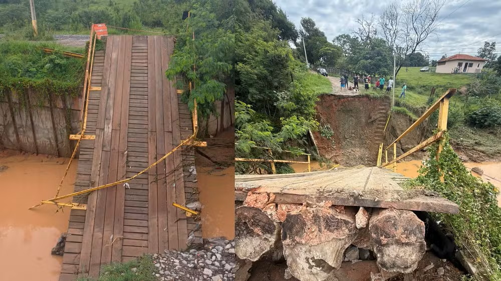 Moradores registraram imagens que mostram parte da ponte submersa no rio, com o local isolado para evitar acidentes.