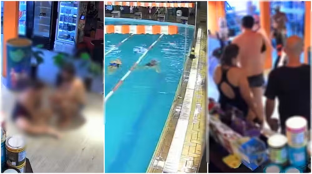 Imagens de câmeras de segurança mostram um homem manuseando um balde com produtos químicos ao lado da piscina enquanto alunos ainda estavam na água. O suspeito ainda não foi localizado.