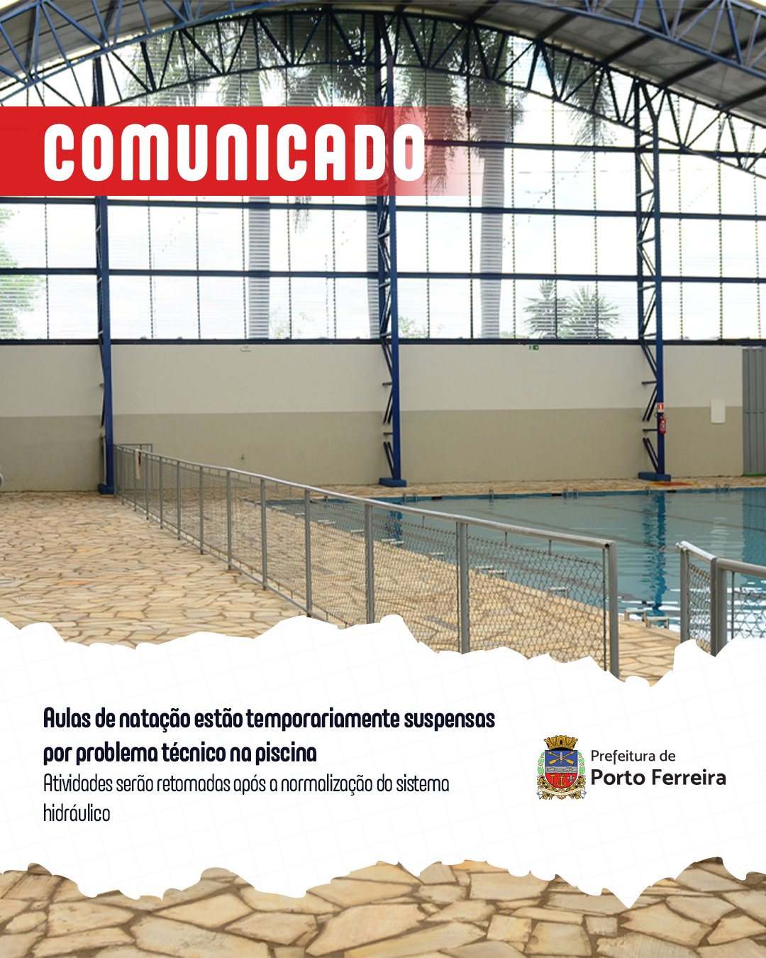 A Secretaria de Esportes e Lazer comunicou a suspensão temporária das aulas de natação em razão de falhas no sistema hidráulico da piscina, causadas por danos na bomba responsável pelo funcionamento do equipamento.