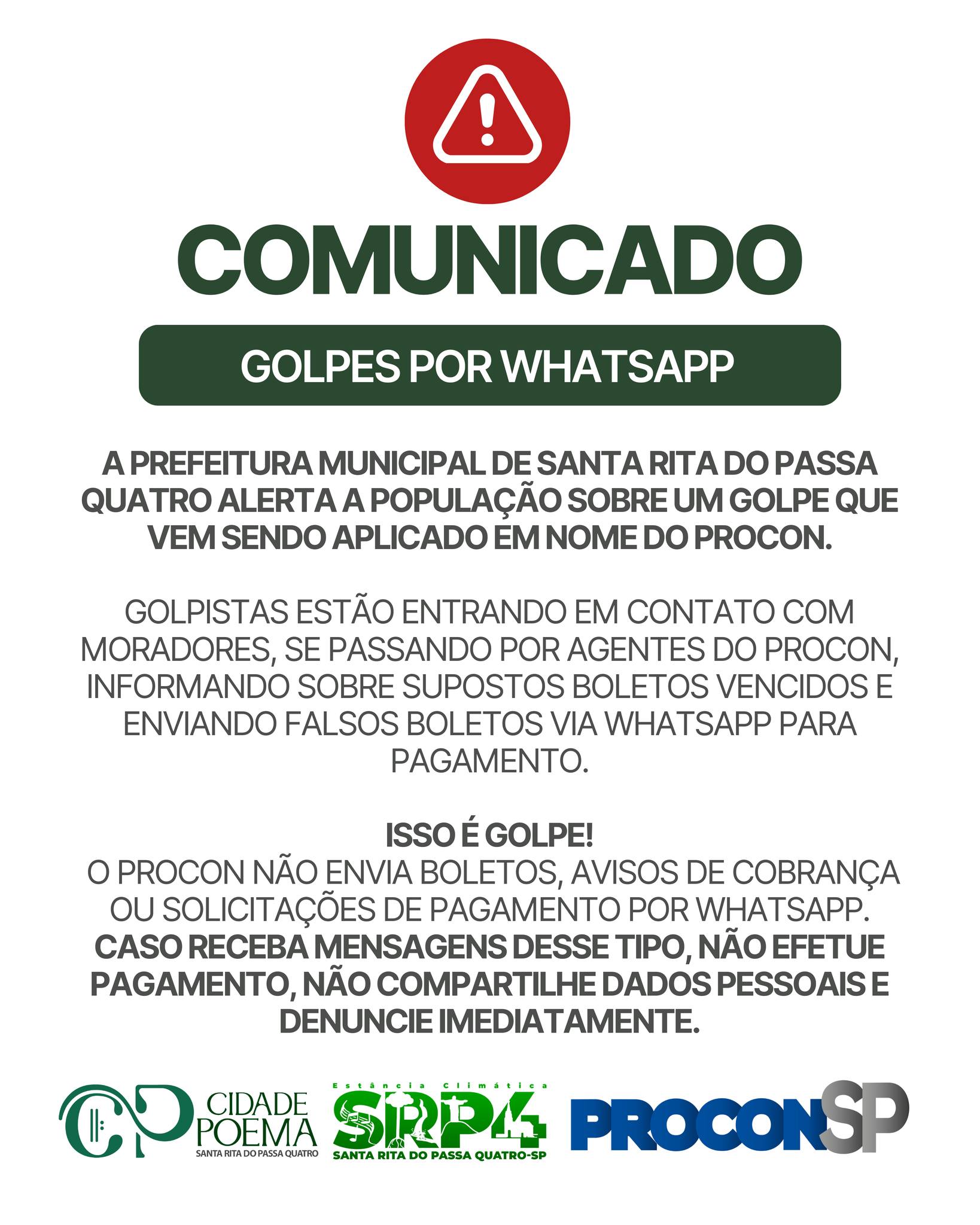 Moradores de Santa Rita do Passa Quatro devem redobrar a atenção diante de um novo golpe que circula pelo WhatsApp. Criminosos estão se passando por supostos agentes do Procon e enviando boletos falsos para tentar enganar a população.