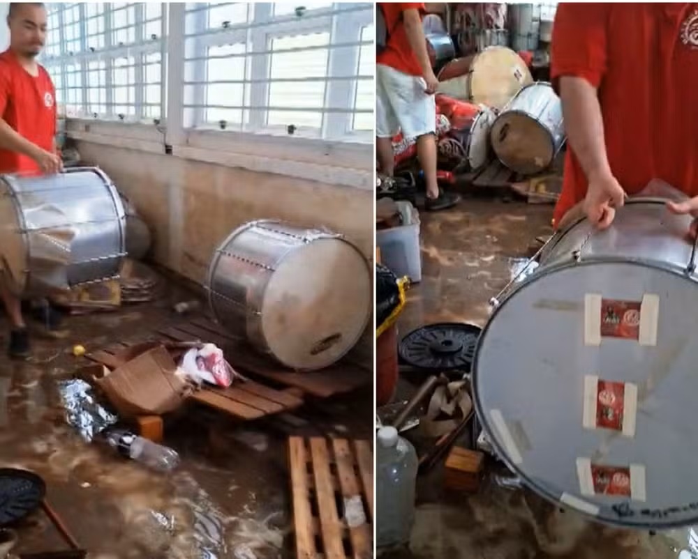 Integrantes relataram que parte dos instrumentos chegou a boiar e acumulou grande quantidade de água. O material foi levado para outra sala, mas o novo espaço é improvisado e também apresenta problemas estruturais.