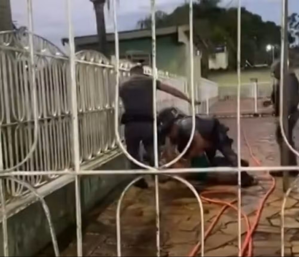 Nas imagens, o jovem já aparece dominado pelos agentes. Mesmo assim, ele é atingido com golpes de cassetete, derrubado no chão e recebe chutes. Pessoas que presenciavam a ação pedem para que as agressões cessem.