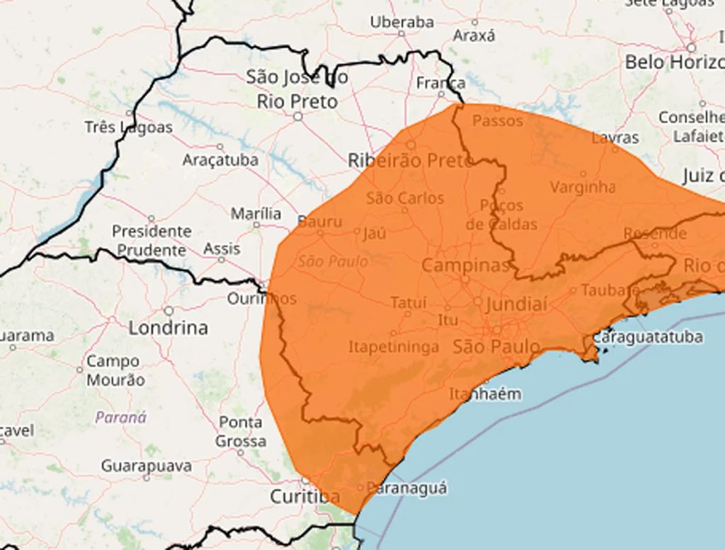 O nível laranja é o segundo mais alto em uma escala de três graus de severidade e atinge áreas das regiões nordeste, leste, central e sul do estado.