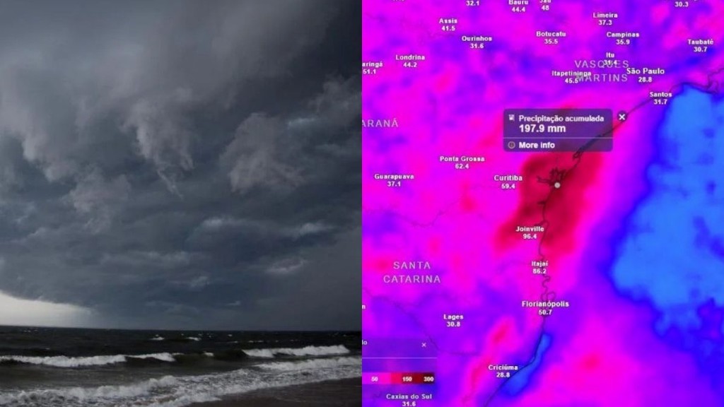 Os maiores acumulados devem ocorrer no leste do Paraná e no litoral norte de Santa Catarina, com volumes que podem chegar a 200 milímetros até o fim de quarta-feira. O cenário aumenta o risco de alagamentos, transbordamento de rios, deslizamentos e ocorrência isolada de granizo.