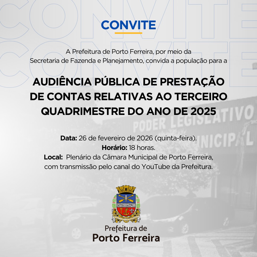 A Prefeitura de Porto Ferreira convida a população para participar da audiência pública referente ao 3º quadrimestre de 2025, em cumprimento ao artigo 9º, §4º, da Lei Complementar 101, de 4 de maio de 2000, conhecida como Lei de Responsabilidade Fiscal. O evento ocorrerá nesta quinta-feira (26/02), às 18 horas, no Plenário Syrio Ignátios, da Câmara Municipal.