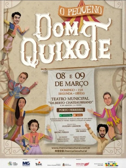 Nos dias 8 e 9 de março, o Teatro Municipal “Gilberto Chateaubriand”, em Porto Ferreira, recebe a adaptação infanto-juvenil do clássico de Miguel de Cervantes, “O Pequeno Dom Quixote”. A montagem, escrita por Gustavo Libanori, com direção de Bruno Ferian e direção musical de Dri Barea, já percorreu diversos estados e conquistou prêmios e indicações, incluindo o Prêmio APCA.
